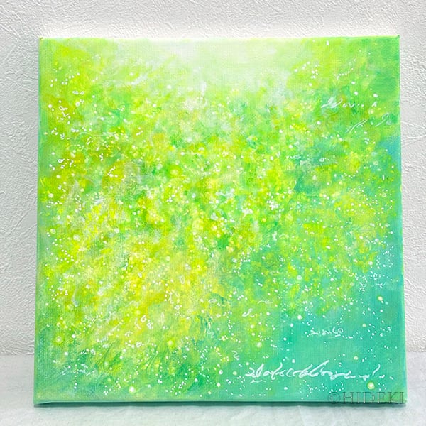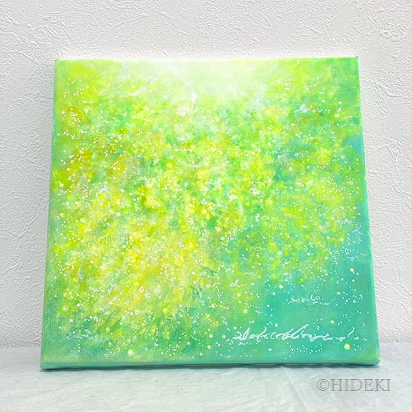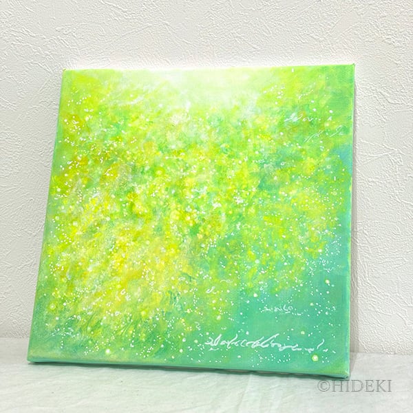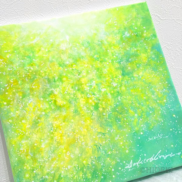 鮮やかな黄色の花々と繊細なタッチが織りなすこの作品は、