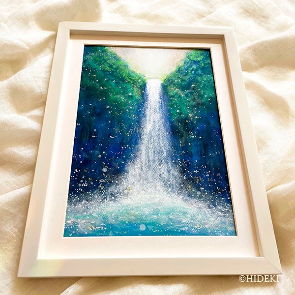 滝が美しく流れる風景画「涼を求めて」。アクリル絵の具を使い、夏の涼しさを表現しました。リアルな滝と清々しい風景が、まるで目の前に広がっているかのような臨場感を与えます。暑い季節には、この絵を見るだけで涼しげな気分に浸れることでしょう。